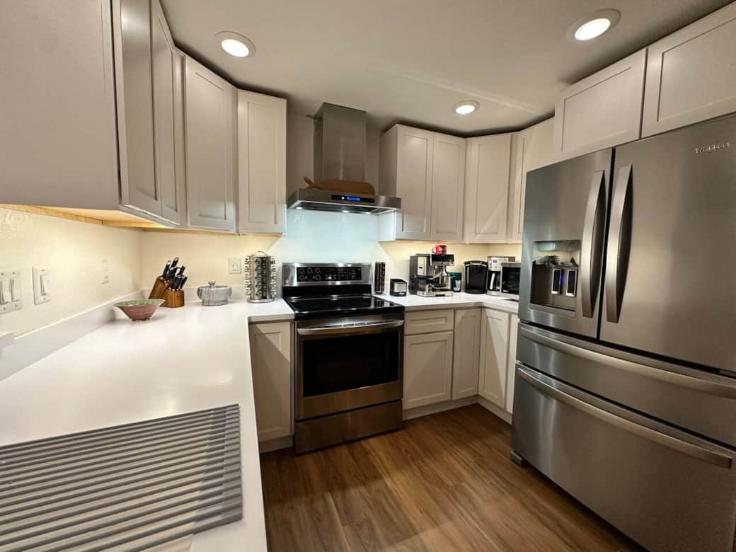 The kitchen has all the cooking gadgets a home cook needs to prepare meals at home.
